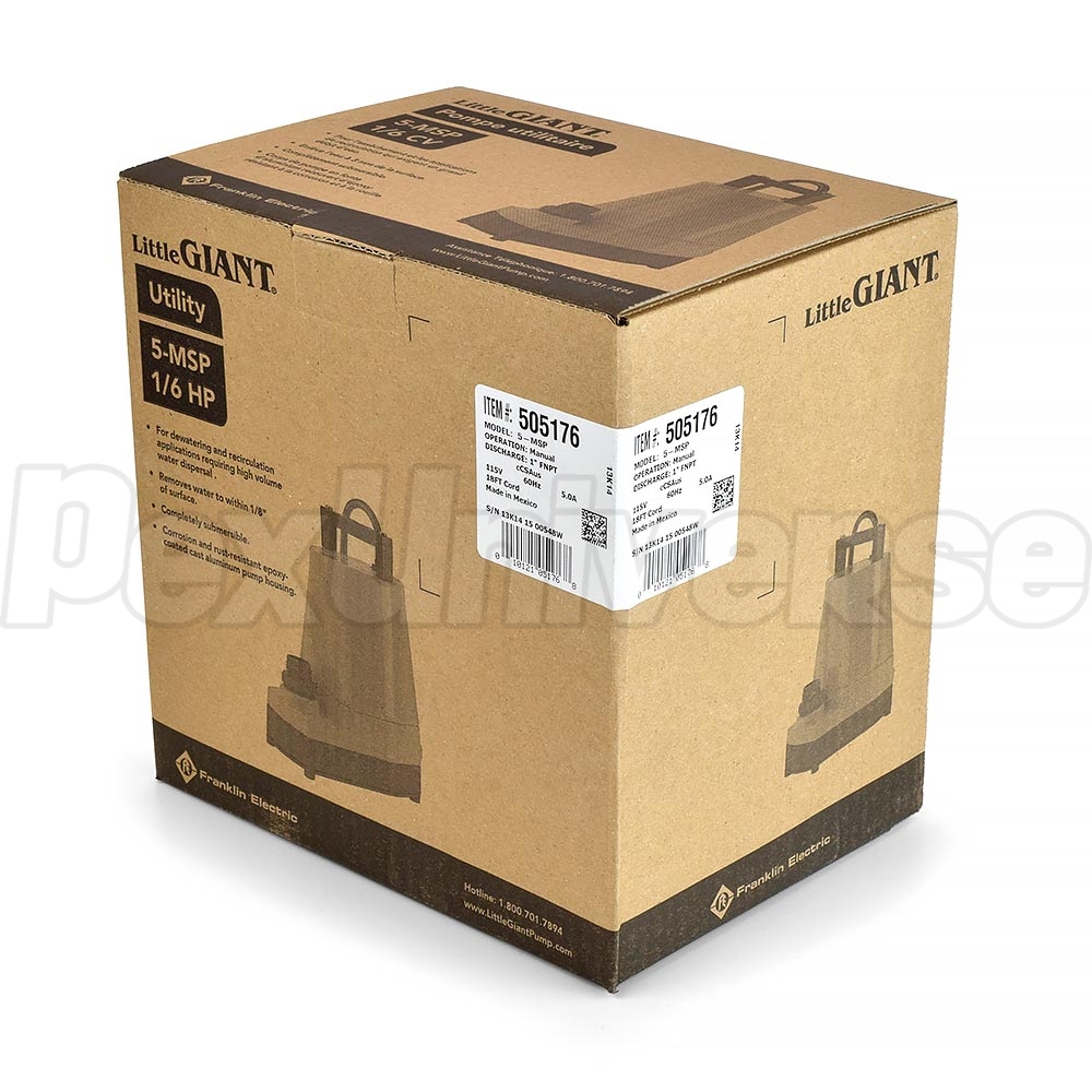 Little Giant 5-MSP (505176) is a 1/6HP, manually-operated, dual-purpose submersible sump pump / utility pump with an 18ft power cord, lubricated for life motor, 1" FNPT discharge and removable inlet screen for easy cleaning. The Little Giant 5-MSP series pumps are capable of pumping water down to 1/8" level.