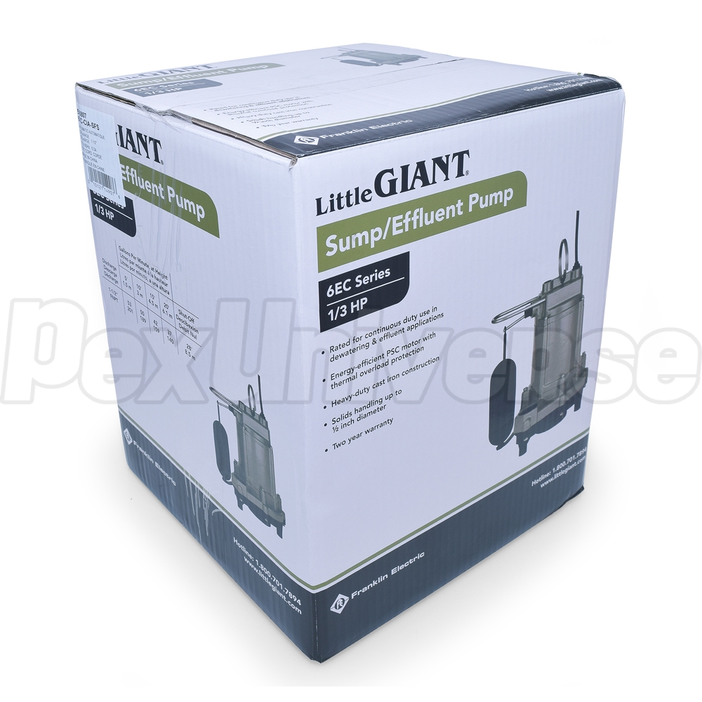 Little Giant 6EC-CIA-SFS (506807) is a 1/3HP dual-purpose Automatic Sump Pump/Effluent Pump with a 10ft power cord and a mechanical float switch. 6EC-CIA-SFS model is designed to work in automatic mode only and is capable of handling water, effluent waste, wastewater and small solids up to 1/2" in diameter. Mechanical float switch on this model will engage the pump once water level reaches 8"-11" and shut down the pump once water level is within 2"-5".