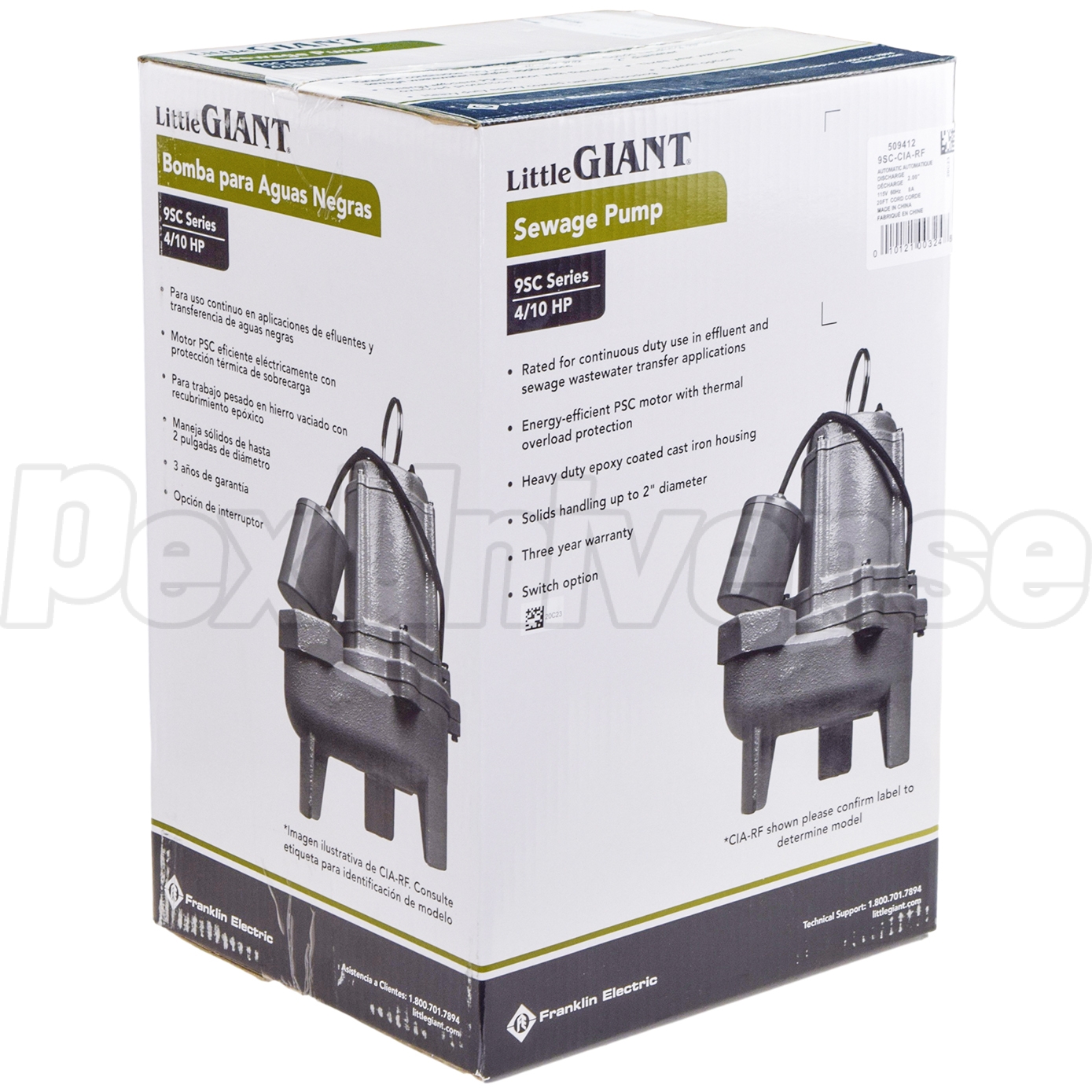Little Giant 9SС-CIA-RF (509412) is a 4/10HP, dual-mode (Automatic or Manual), Submersible Sewage Pump with a Remote Piggyback-type Float Switch and a 20ft long power cord. The piggyback remote float switch allows to regulate the On and Off levels for the automatic operation mode of the pump. When mounted on the pump (default install), the float switch has On a level range of 16"-19" and Off level range of 9"-11". The 509412 model also features an oil-filled motor (lubricated for life), 2" high legs and a 2" FNPT discharge.