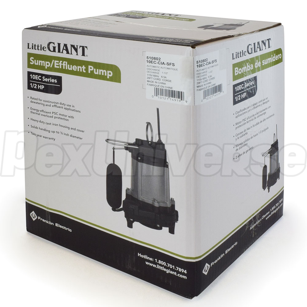 Little Giant 10EC-CIA-SFS (510802) is a 1/2HP Automatic Submersible Sump Pump with a 20ft power cord and an integral snap action float switch.