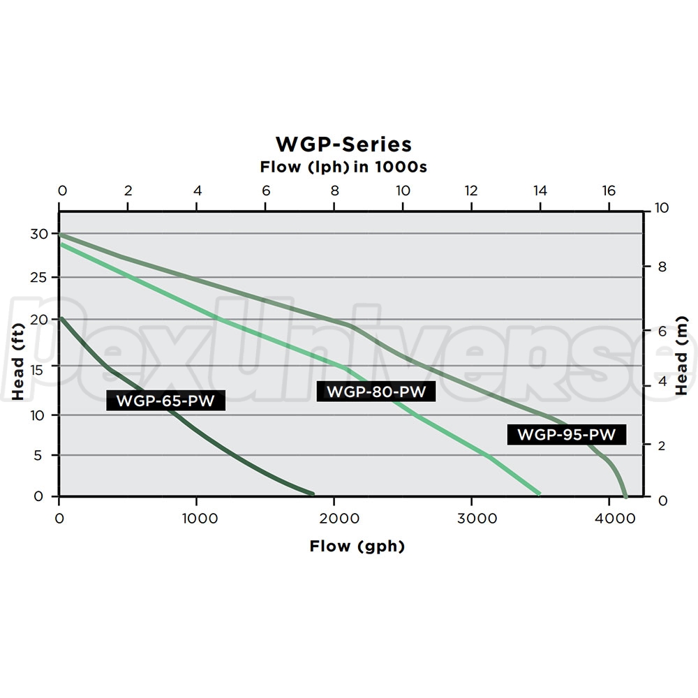 Little Giant WGP-65-PW (566409) is a 1/8HP Direct Drive Dual Discharge Pond/Waterfall Pump with 16' cord. This Little Giant Pump has the unique feature of having dual 1-1/4" FNPT discharges and has been designed to operate waterfalls, streams, and fountainheads or just circulate the water in a pond. Dual discharges of the Little Giant WGP-65-PW pond pump make it possible to perform two of the above tasks at the same time without having to purchase two pumps. A cap plug included to allow one of the discharges to be closed if only one discharge is to be utilized. An elbow adapter is also included to adapt from the discharge of the pump to 1" smooth tubing.