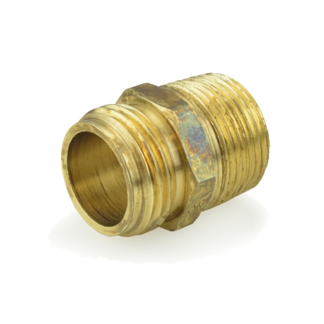 3/4" Male Garden Hose x 3/4" Male Threaded (MIP/MPT) adapter fitting connects 3/4" female threaded hose outlet to 3/4" female threaded fitting or outlet in a straight line. Made in the USA from solid, lead-free brass and approved for potable water applications.
