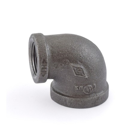 This black malleable iron elbow connects 1-1/2" to 1" pipes at a 90-degree angle. Approved for potable water use.