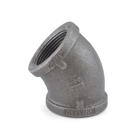 This black malleable iron elbow connects two 1-1/4" pipes together at a 45-degree angle. Approved for potable water use.