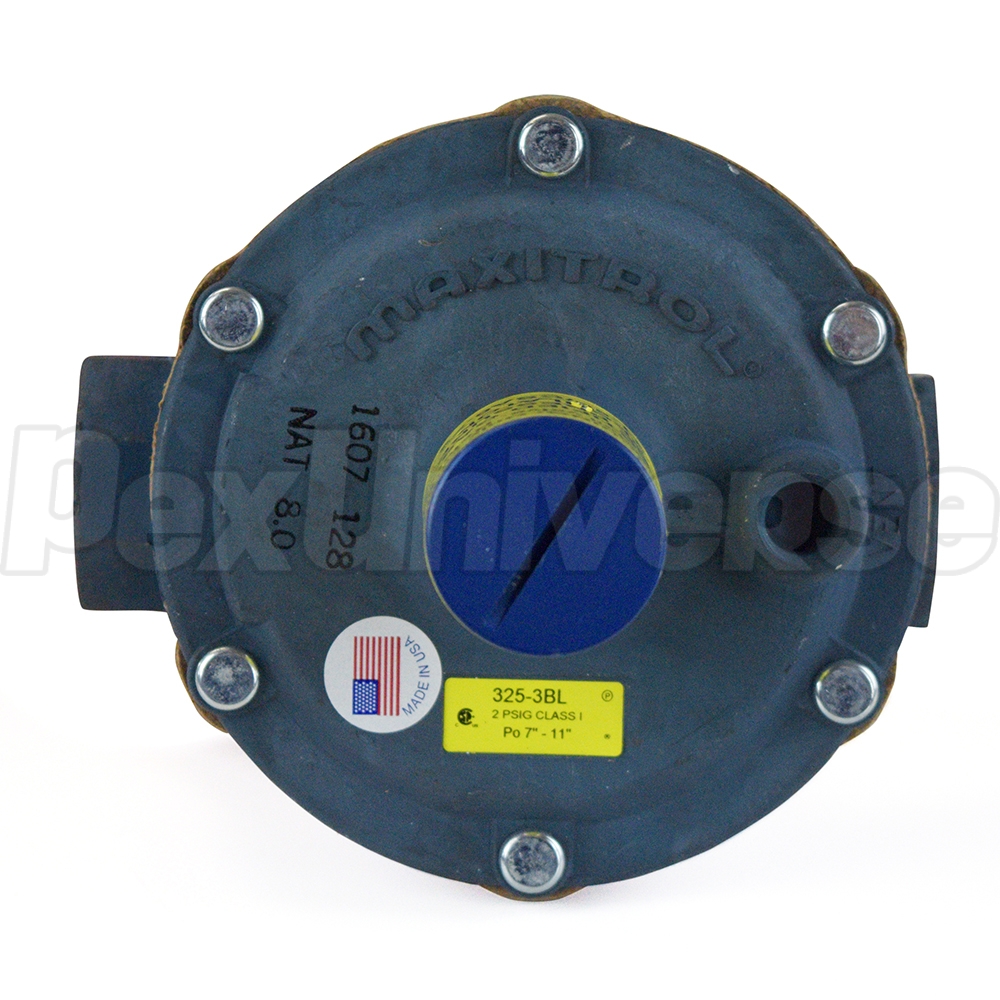 325-3BL series, Maxitrol 1/2" gas line pressure regulator with Imblue coating for improved corrosion resistance in outdoor applications.