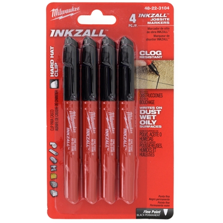 Inkzall markers are ideal for most plumbing and construction jobs and can easily write on a large variety of wet, dry, dusty or oily surfaces, including metal and plastic pipes, concrete, bricks, wood/plywood/OSB and many others. They are designed to resist drying & clogging, roll-off resistant and come with a hard hat clip. Fine point style is the most common and is the preferred choice for making marks on pipes, wooden, ceramic and other surfaces. Qty: 4. Color: Black. Tip Style: Fine Point.