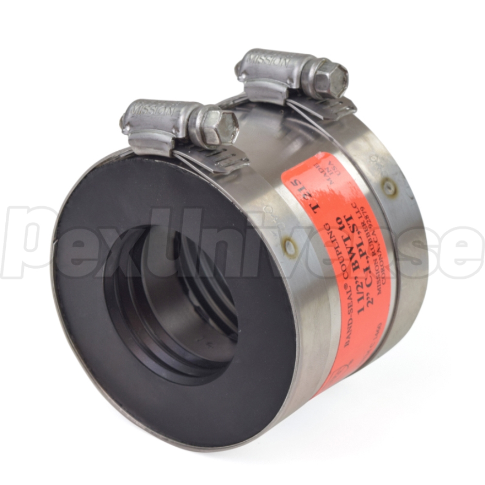 This Mission specialty reducing coupling connects 1-1/2" tubular to 2" no-hub cast iron/extra-heavy cast iron/plastic/steel pipe.