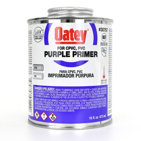 16 oz. can with dauber of Oatey purple primer is perfect for all schedules and classes of PVC and CPVC pipe and fittings. The primer removes contaminants such as surface dirt, grease, and grime as well as softens the pipe surface to allow for a fast and secure solvent weld.
