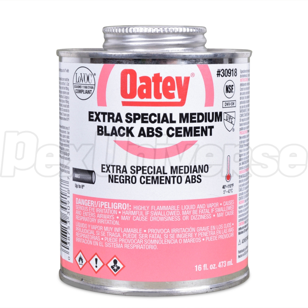 16 oz. can with dauber of Oatey extra special black ABS cement for all non-pressure applications. Formulated for use in hot and arid climates in the western US.