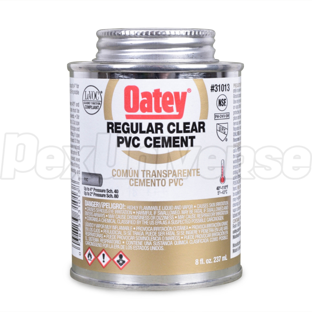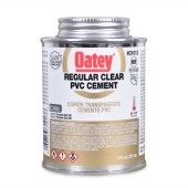 8 oz. can with dauber of regular-body clear Oatey PVC cement for DWV pipe, pressure pipe, potable water, and electrical (conduit) applications.