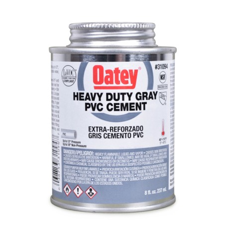 8 oz. can with dauber of Oatey heavy-body gray PVC cement for DWV pipe, pressure pipe, potable water, and electrical (conduit) applications.