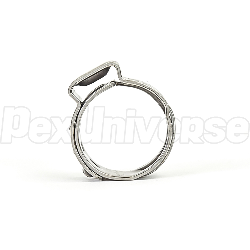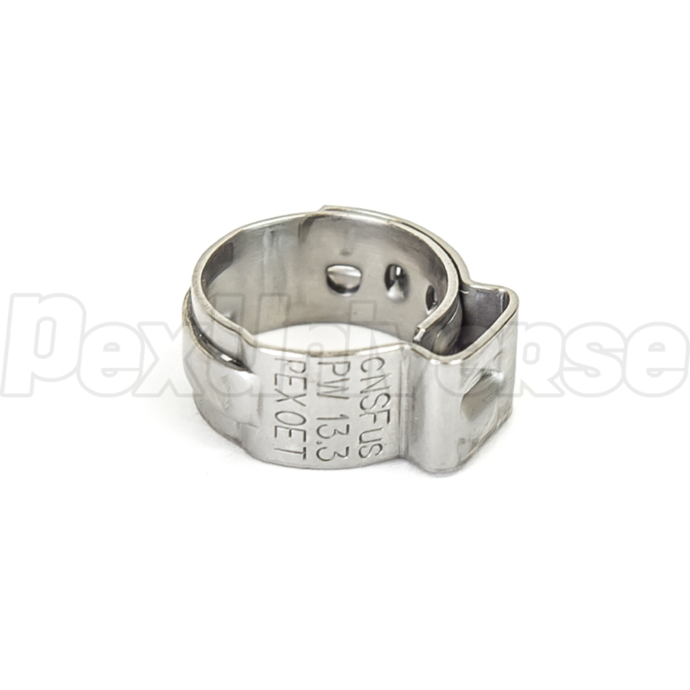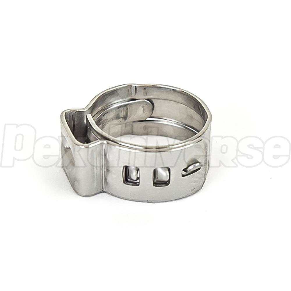 Partially clamped (pinched) to prevent accidental slipping of the clamp along the pipe during the installation process. Oetiker brand 3/8" Stainless Steel Clamps are intended for use with a PEX Clamp (Cinch) Tool, 3/8" PEX tubing and 3/8" crimp style PEX fittings (brass or poly).