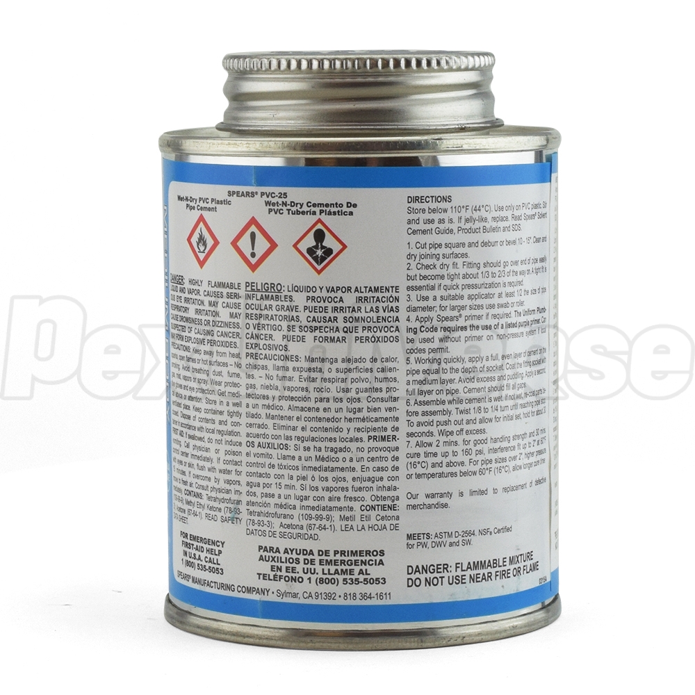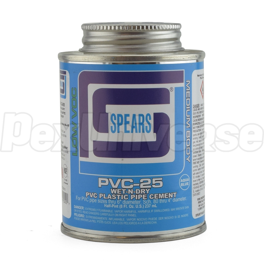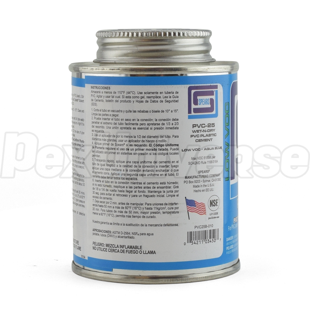8 oz can with dauber of Wet-N-Dry series PVC cement intended for use with all classes and schedules of PVC pipe and fittings. Wet-N-Dry is a very-fast setting cement and is ideal for quick pressurization in wet conditions, including plumbing, pool & spa, irrigation and others. Primerless capability allows for installation without using primer where allowed by code. This cement has aqua blue color, but will fade to clear in sunlight.