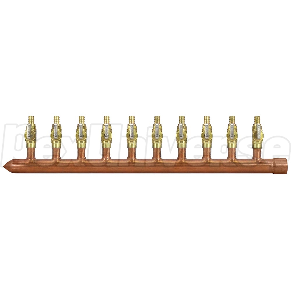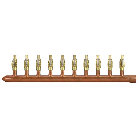 10-port Copper Manifold with 1/2" PEX Valves, 1" Sweat, Closed, Left-Hand