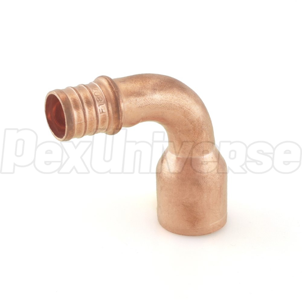 This fitting is intended to provide a transition from 3/4" PEX pipe to 3/4" copper pipe (female sweat) at a 90-degree angle. Sweat portion of the fitting is female sweat and is the same size as a regular 3/4" copper fitting. Made in the USA from 100% copper and is approved for potable water applications.