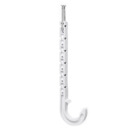 Hangs Tuff J-Hook plastic hanger for 1-1/4" copper, PVC or ABS pipes. Comes with zinc plated rust-resistant nails for securing the hanger to wood studs. Made in the USA.