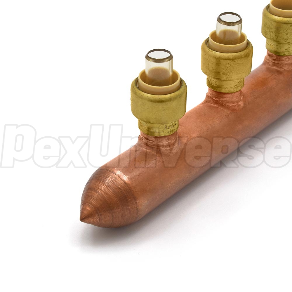 6-Branch Sioux Chief 672Q series manifold features push-fit (or push-to-connect) outlets of the same type as SharkBite fittings by Cash Acme. These outlets can accept PEX, copper or CPVC pipes of appropriate sizes and require no special tools. PEX stiffeners are included and can easily be removed if needed.