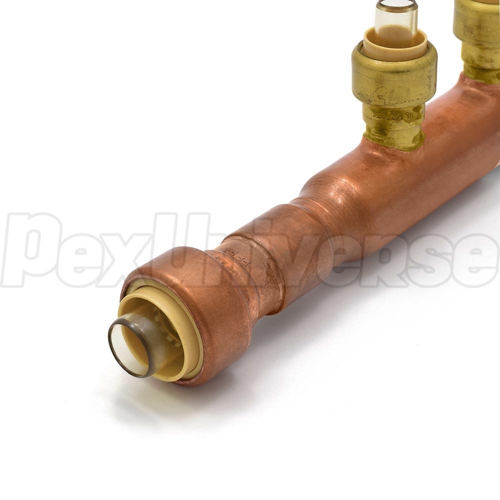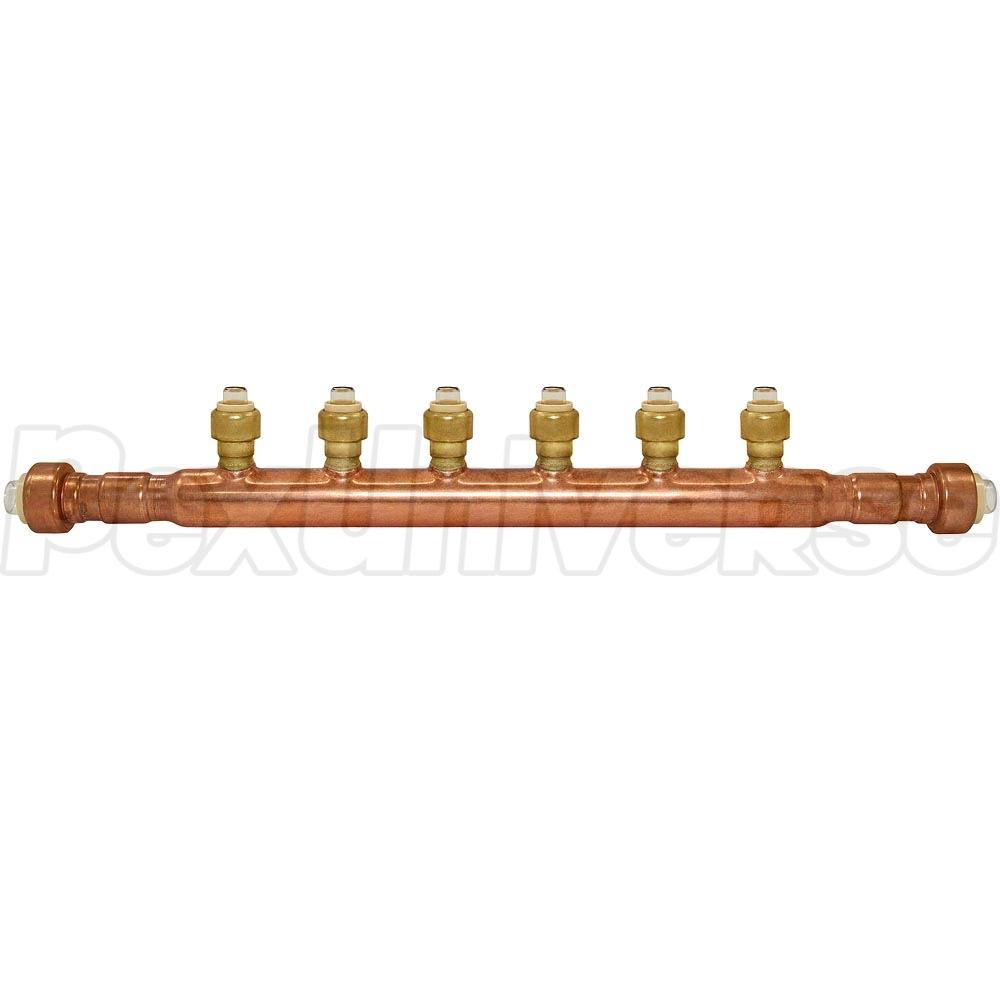 6-Branch Sioux Chief 672Q series manifold features push-fit (or push-to-connect) outlets of the same type as SharkBite fittings by Cash Acme. These outlets can accept PEX, copper or CPVC pipes of appropriate sizes and require no special tools. PEX stiffeners are included and can easily be removed if needed.