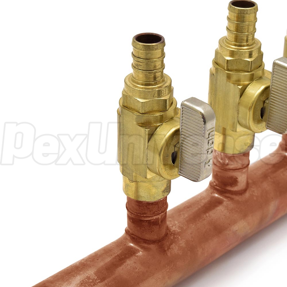 Copper manifold by Sioux Chief with crimp style, 1/4-turn shut-off brass ball valves and crimp style PEX inlet/outlet connections.