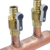 Sioux Chief BranchMaster manifold with (12) 1/2" PEX expansion ball valve outlets (F1960), 3/4" male sweat (same size as 3/4" copper pipe) trunk inlet and a spin closed trunk on one side. Compatible with PEX-A tubing only.