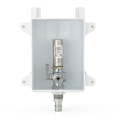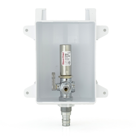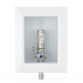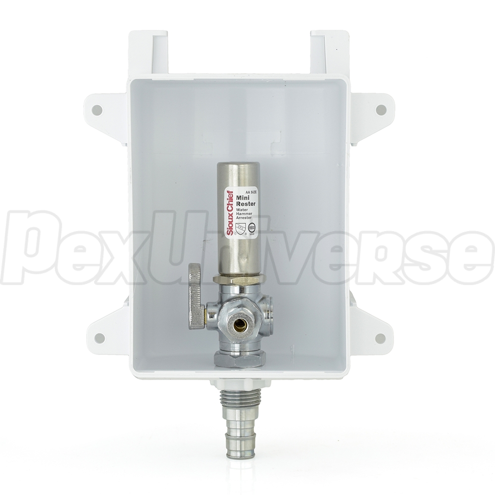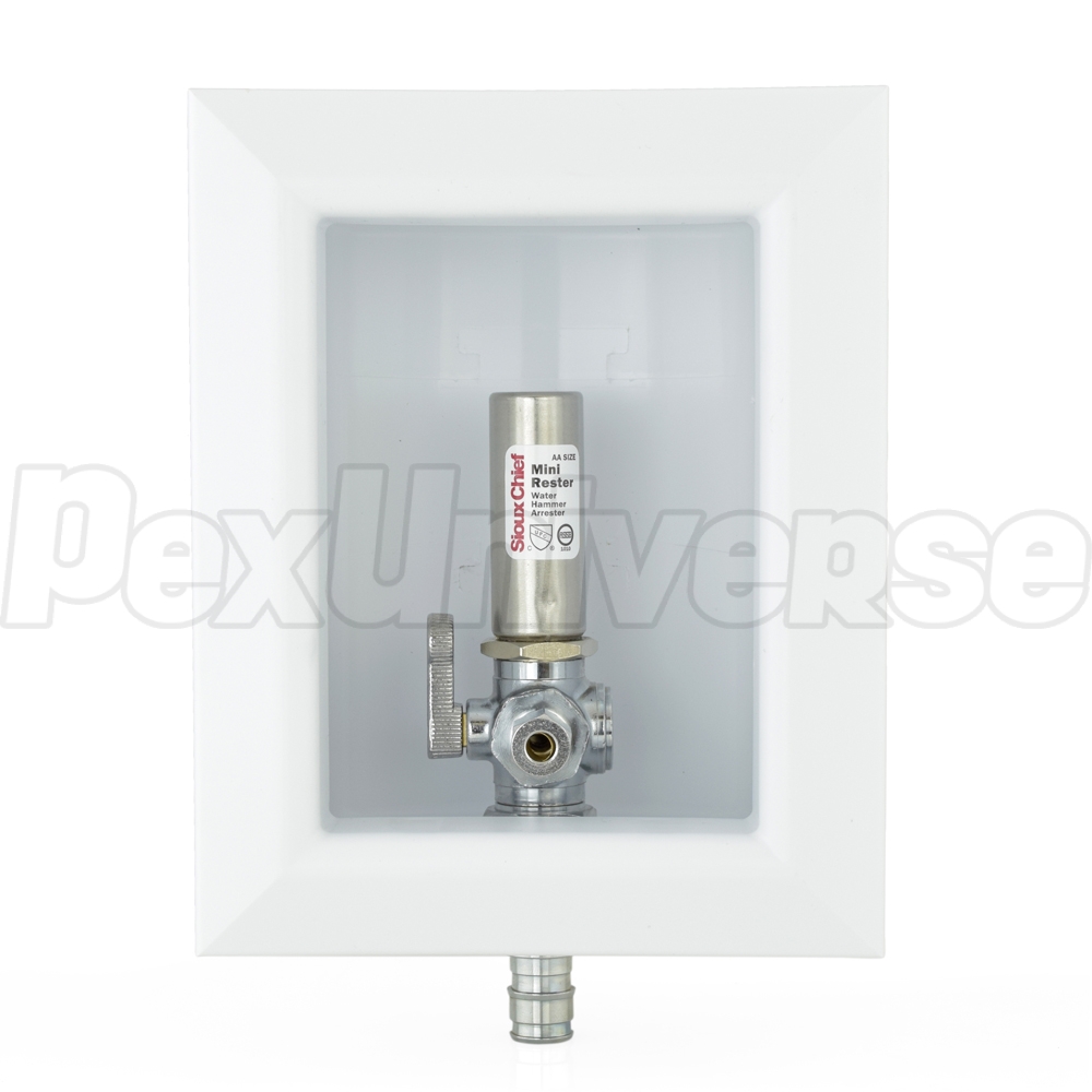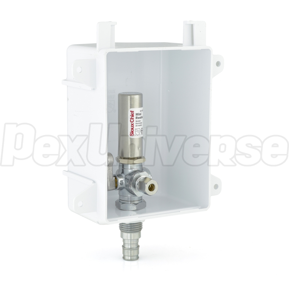 Sioux Chief Ox Box Icemaker Outlet Box kit with 1/2" PEX expansion connection (F1960) and water hammer arrestor. Includes (1) Outlet box with 1/4 turn ball valve (1/4" OD compression outlet) and frame, (1) Debris cover.