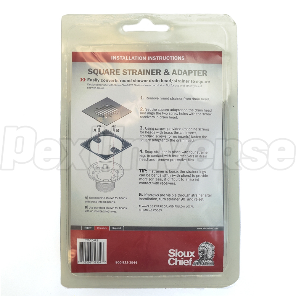 Round-to-Square adapter allows to easily convert from round to square type screw-in strainer for 821-T200(P) Sioux Chief shower drain model. Comes with square 19-gauge stainless steel strainer and two sets of screws with matching finish. Strainer size (L x W): 4-3/8".