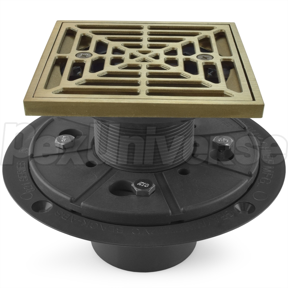 Square PVC Shower Tile/Pan Drain w/ Brushed Bronze Strainer, 2" Hub x 3" Inside Fit