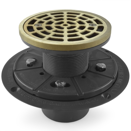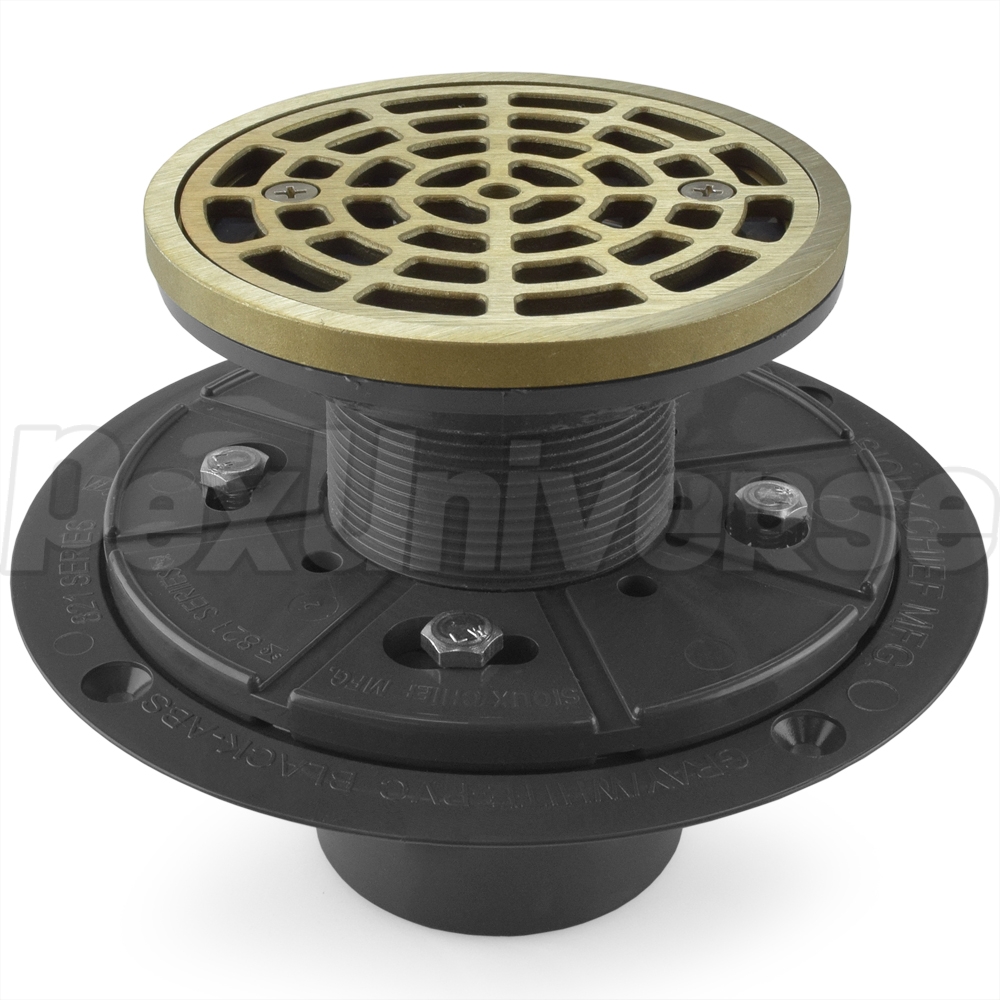 Sioux Chief 821 series, USA-made PVC drain for tile showers with solid cast, brushed nickel bronze round screw-on strainer and rim. Will not corrode over time and complements other shower/bathroom fixtures with brushed brass or bronze finish. Installed in combination with a shower pan liner and finished with tile. Adjustable height top easily accommodates various mortar bed thicknesses. Connects to standard 2" PVC drain pipe or inside a 3" PVC fitting. Premium quality & rugged, heavy-duty design.