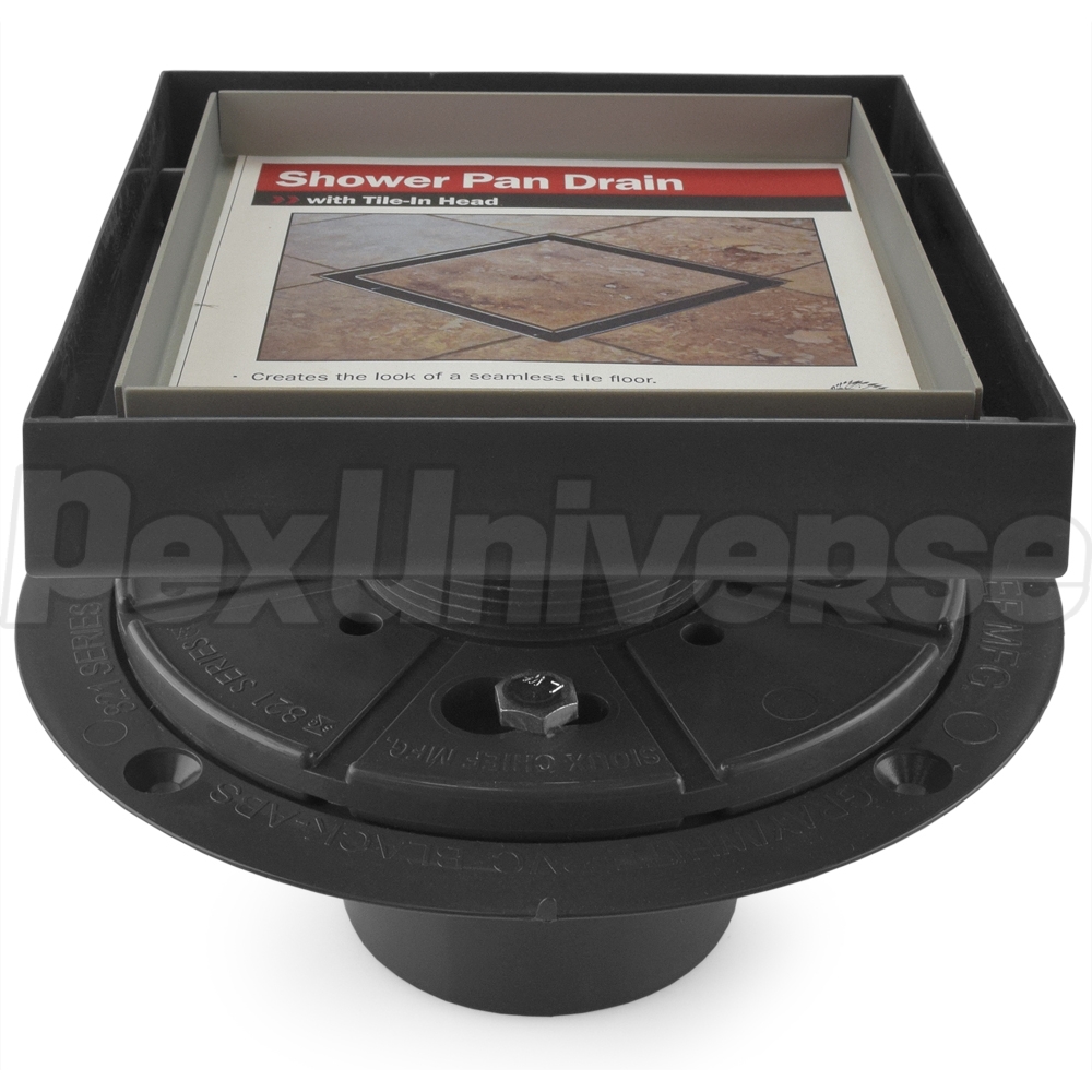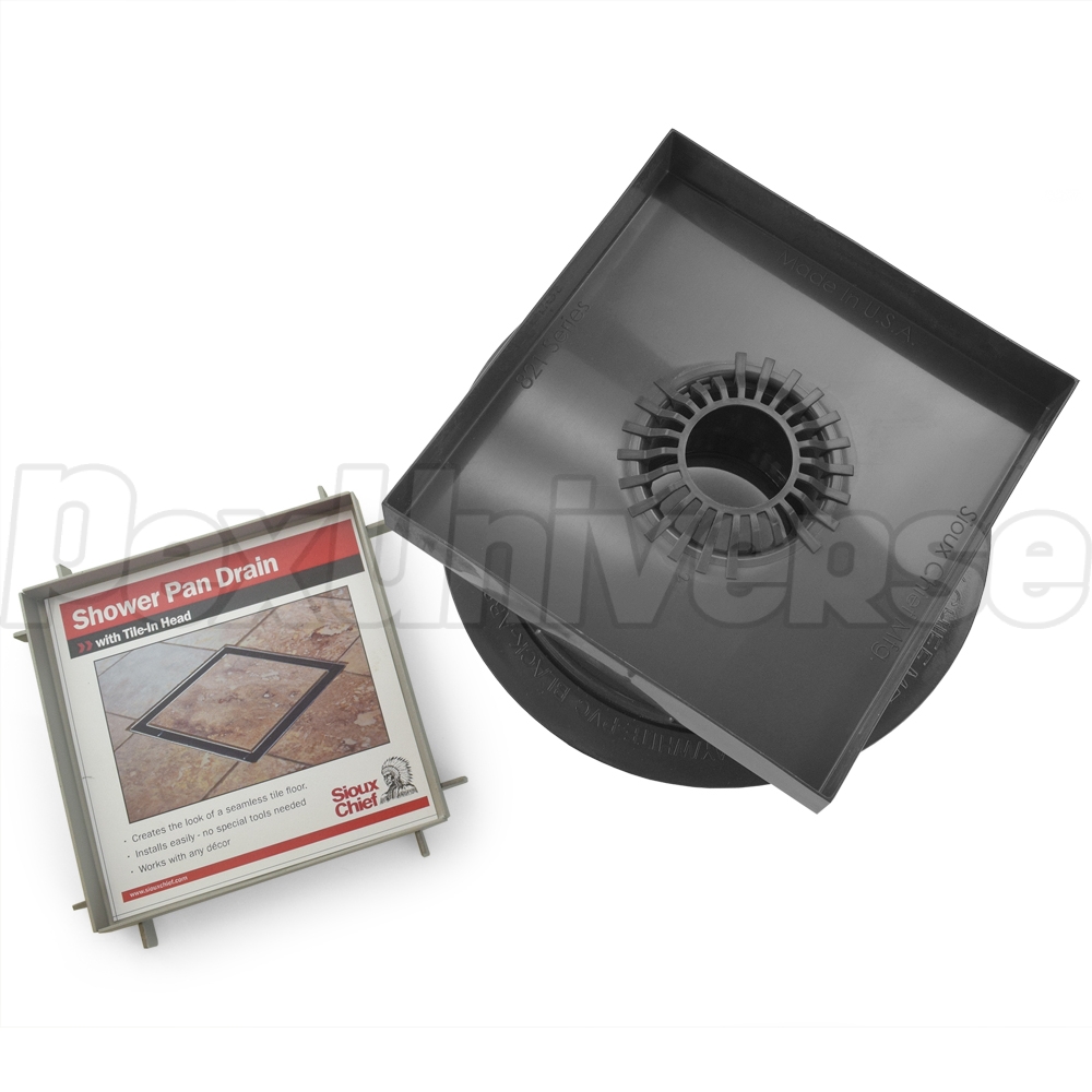 Sioux Chief 821 series, USA-made shower drain with 5" x 5" tile insert grate. Installed in combination with a shower pan liner and finished with tile. Innovative design allows to seamlessly create shower drainage without the color/finish matching struggles. Adjustable height top easily accommodates various mortar bed thicknesses. Rugged PVC body and thick, durable stainless steel grate ensure worry-free performance. Grate is removable and allows access to a secondary built-in strainer which catches hair & small items, facilitating easy cleaning w/out drain chemicals and easy retrieval of jewelry, etc. Connects to a standard 2" PVC pipe.