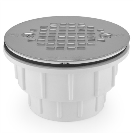 Standard PVC shower drain intended for installation with fiberglass shower bases, one-piece shower units or similar. 2" Hub connection accepts/fits over standard 2" PVC pipe (both Sch. 40 and 80). Comes with a screw-on type 19-gauge stainless steel strainer and matching screws. High quality and durable, made in the USA by Sioux Chief.