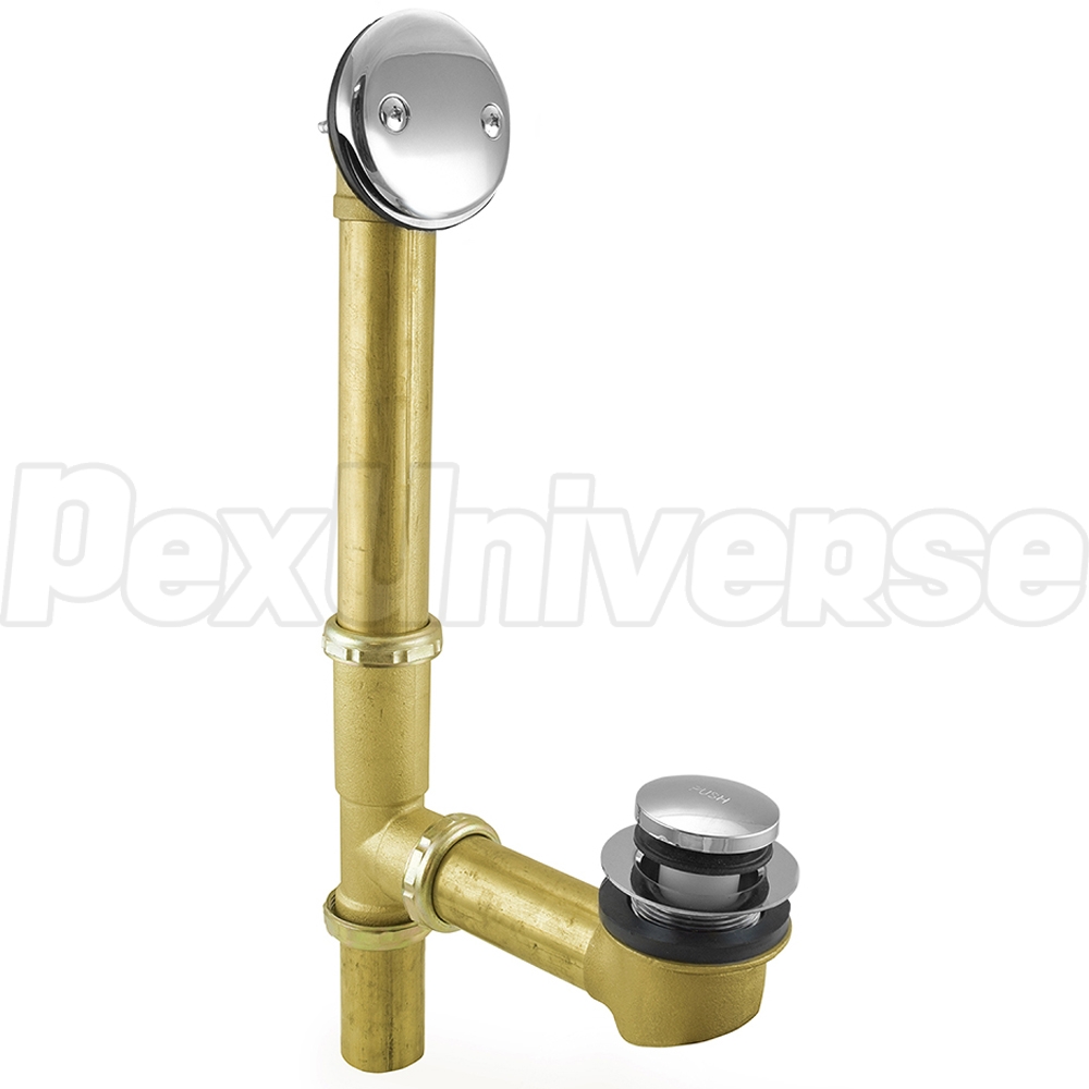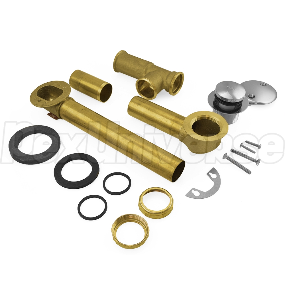 This is a complete pop-up (toe-touch) type bath waste kit, designed to fit all standard-size tubs with 12"-15" rise from tub ledge to the floor. Has 1-1/2" rough brass tubular tubing, solid brass parts and chrome-plated trim. Includes all parts shown.