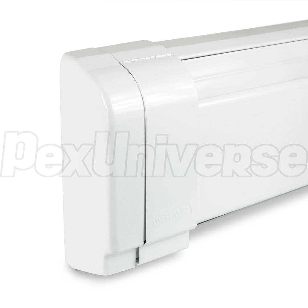Hinged slip-on Left end cap for Multi/Pak 80 baseboard by Slant/Fin, designed to provide convenient access to an air bleeder valve or a temperature regulating or shut-off valve. Allows to cover small gaps between the baseboard and adjacent wall. Drawn steel design with rounded edges offers a better look and is safer than welded counterparts. White enamel finish.