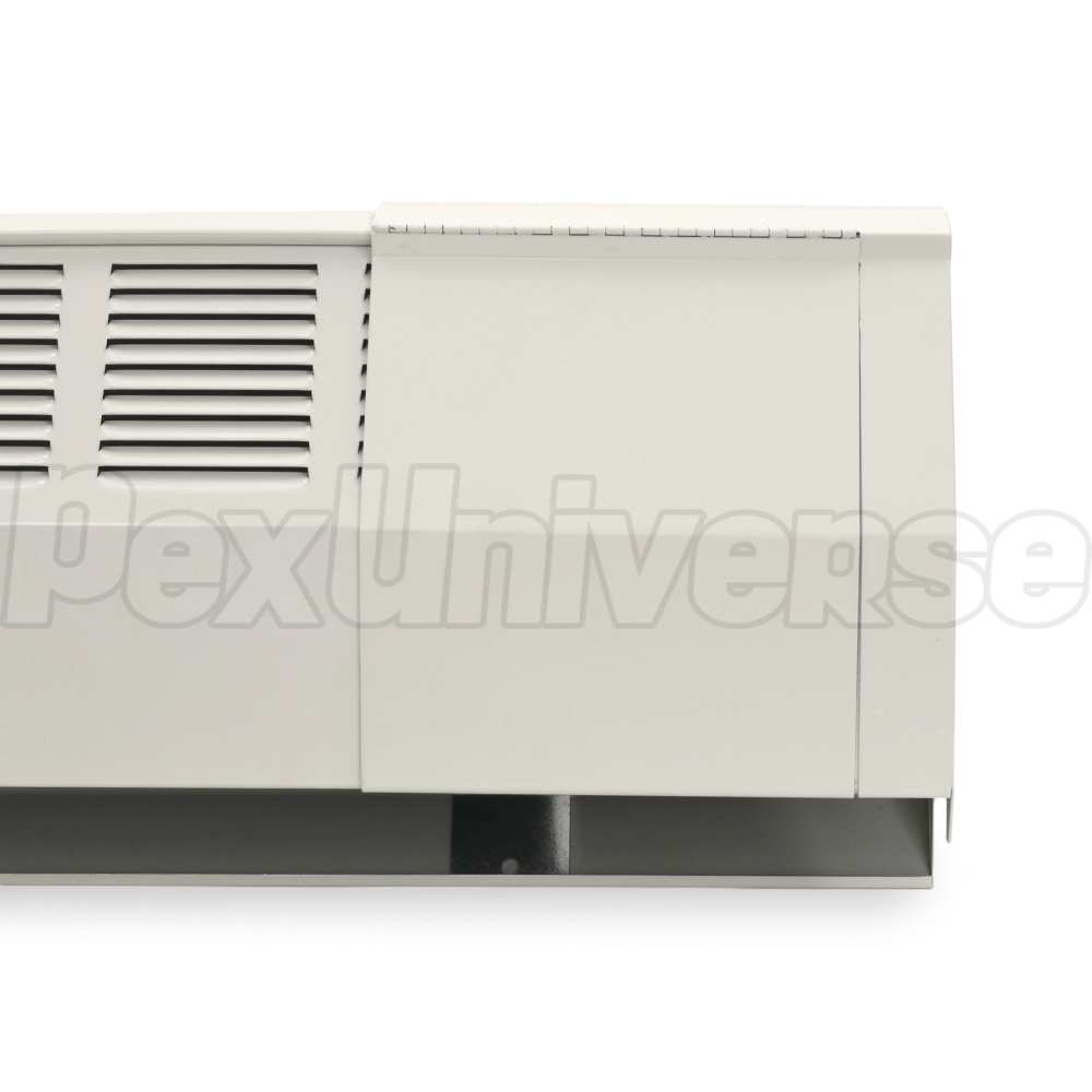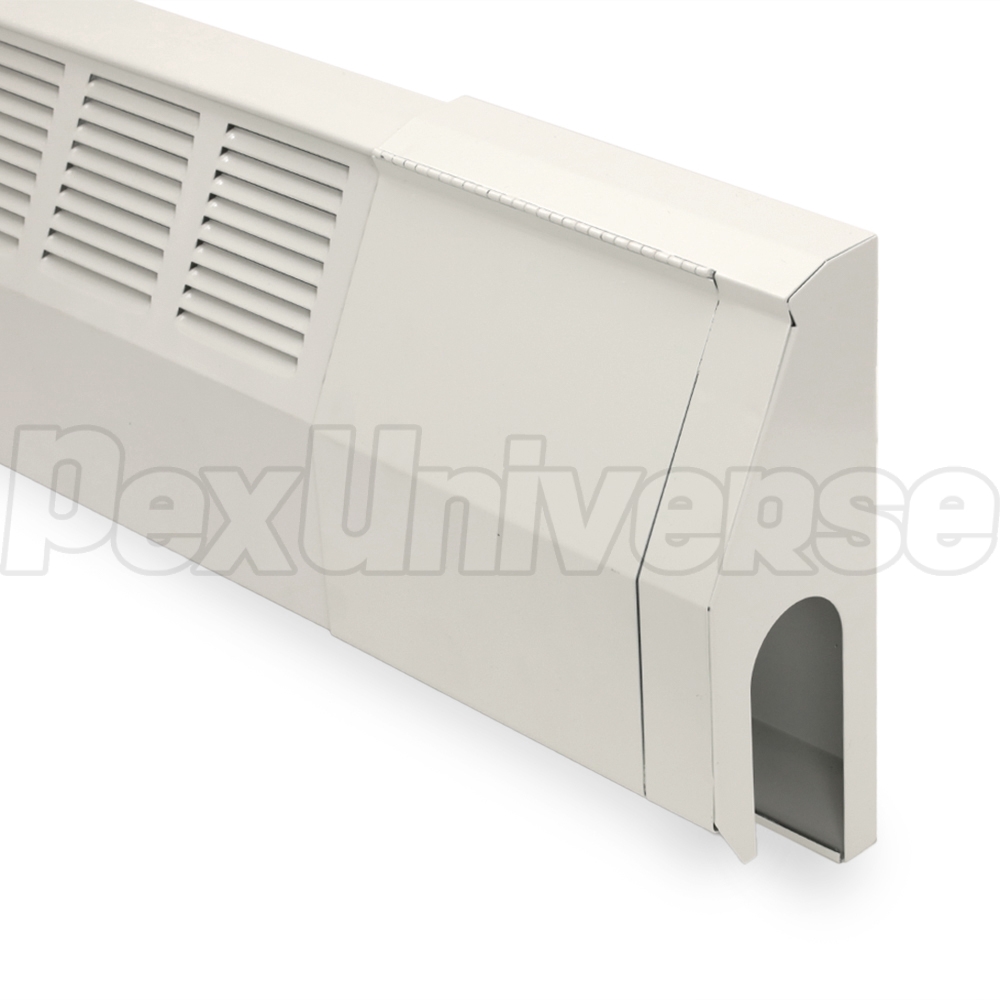Extra-wide slotted hinged slip-on Right valve cover for 350-10 baseboard by Slant/Fin, provides convenient access to shut-off, temperature regulating or an air bleeder valve. Slotted opening accommodates pipe where it penetrates adjacent wall. Durable white enamel finish.