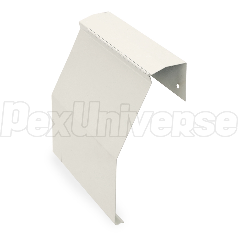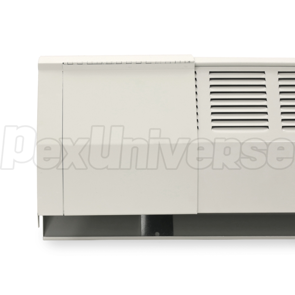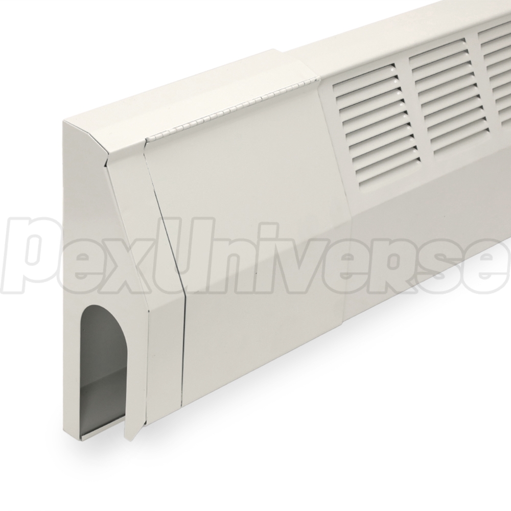 Extra-wide slotted hinged slip-on Left valve cover for 350-10 baseboard by Slant/Fin, provides convenient access to shut-off, temperature regulating or an air bleeder valve. Slotted opening accommodates pipe where it penetrates adjacent wall. Durable white enamel finish.