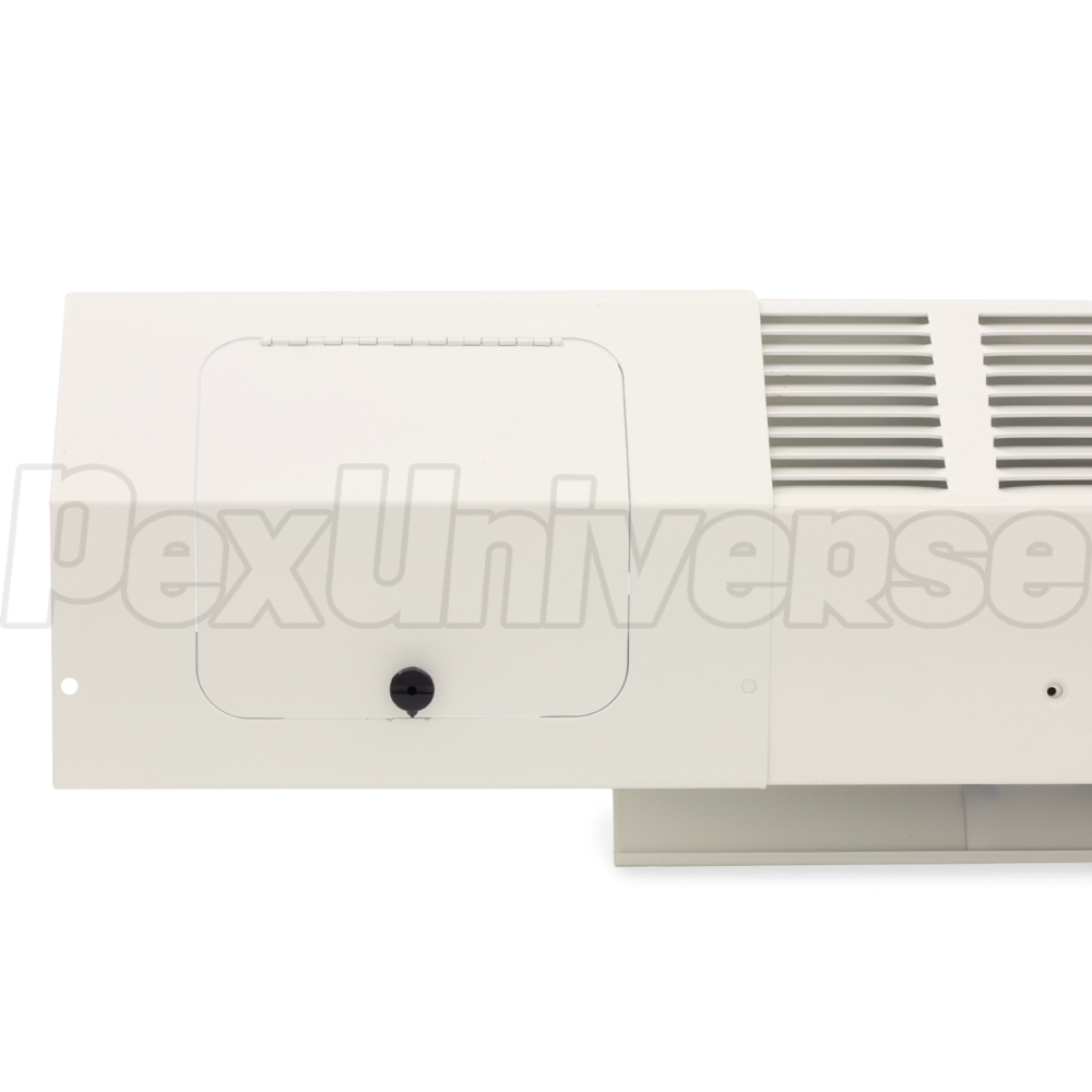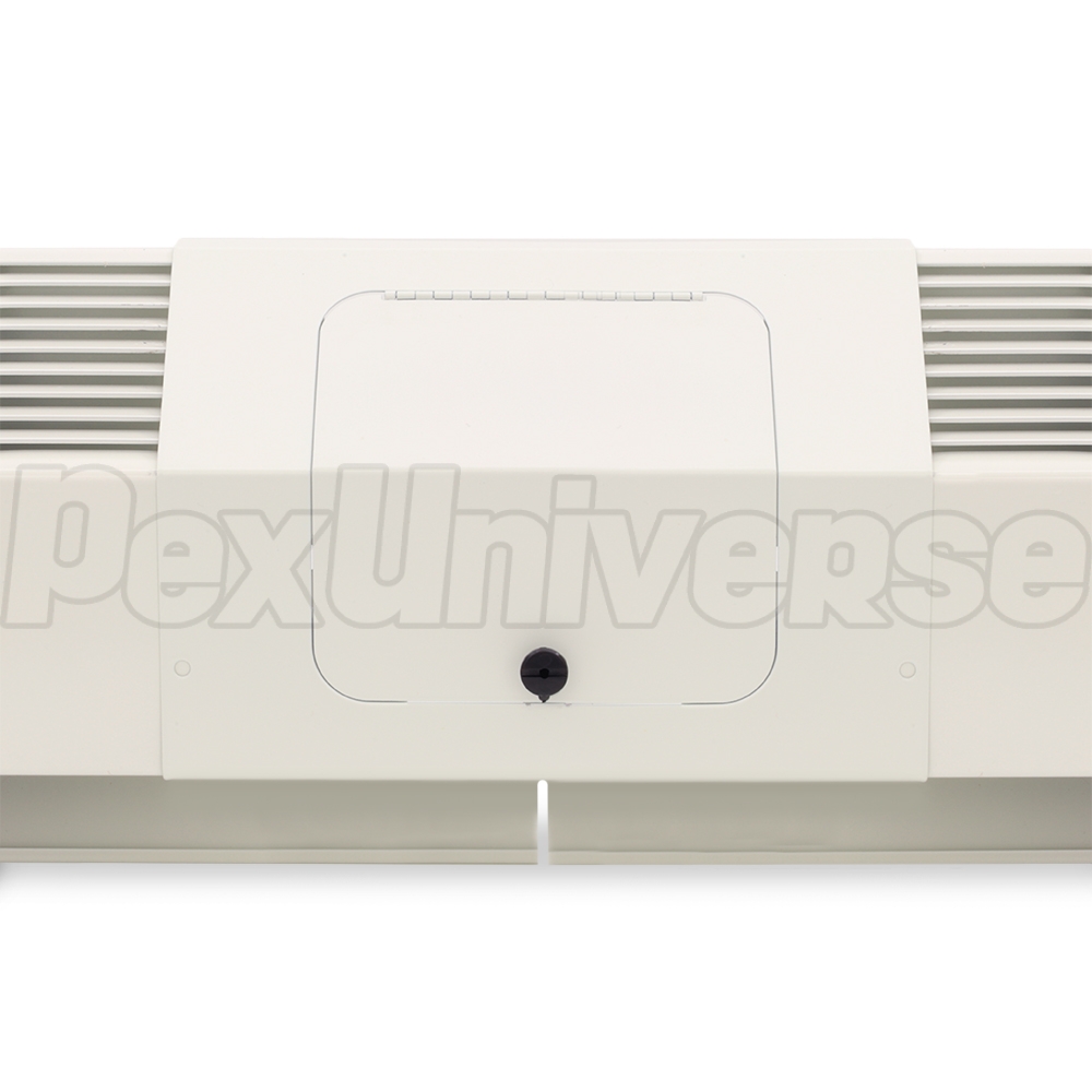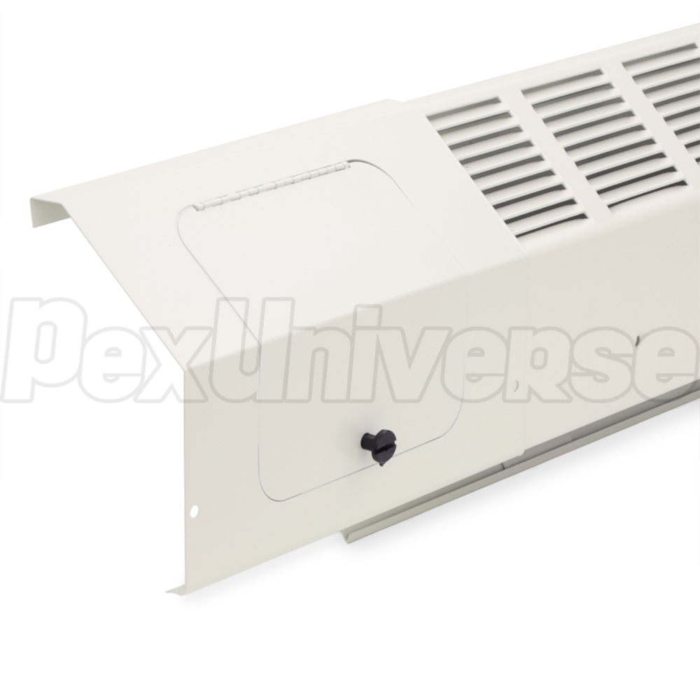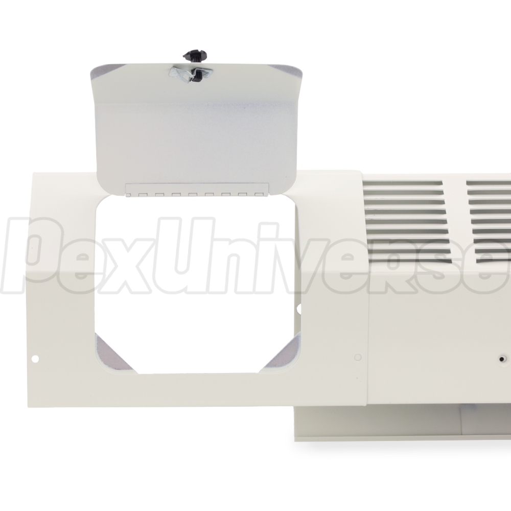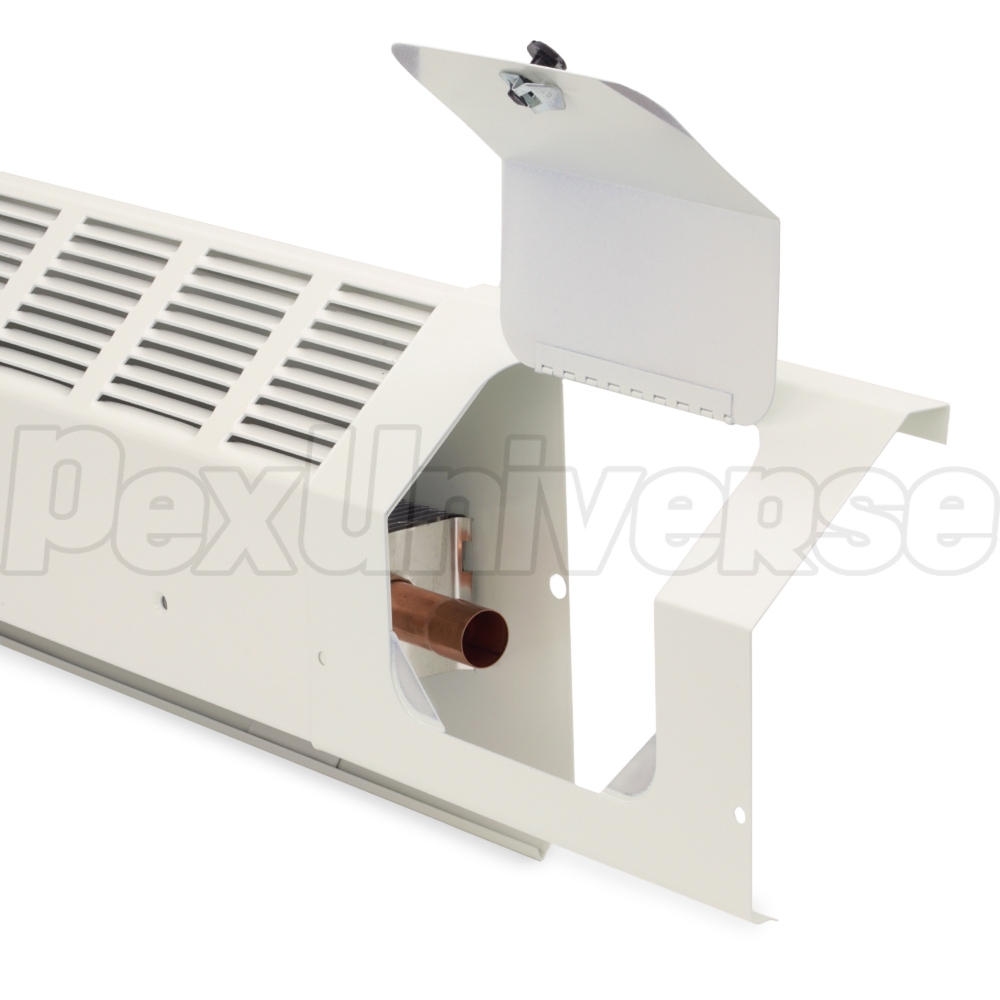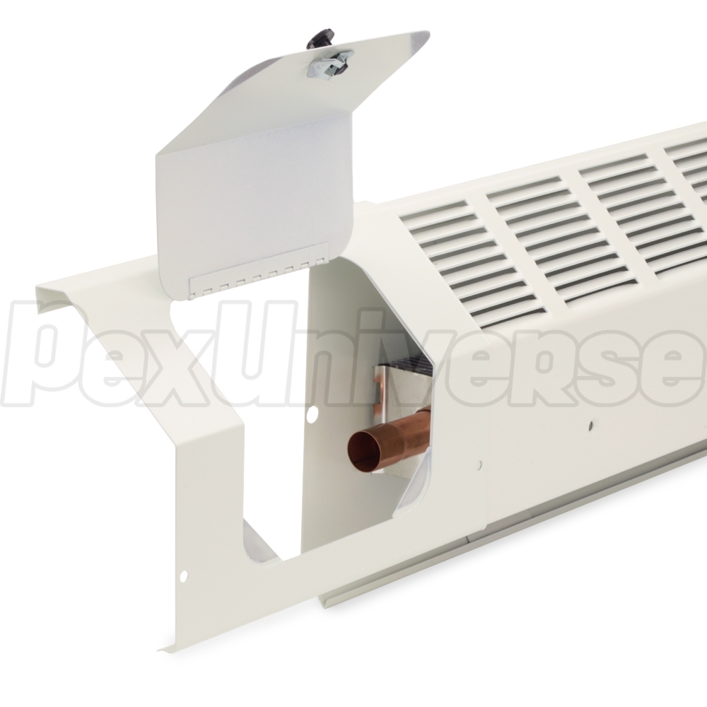 Extra-wide, slotted slip-on Center valve cover for HD-850 baseboard by Slant/Fin, covers an air bleeder, a temperature regulating or shut-off valve. White enamel finish.
