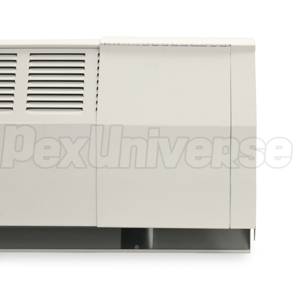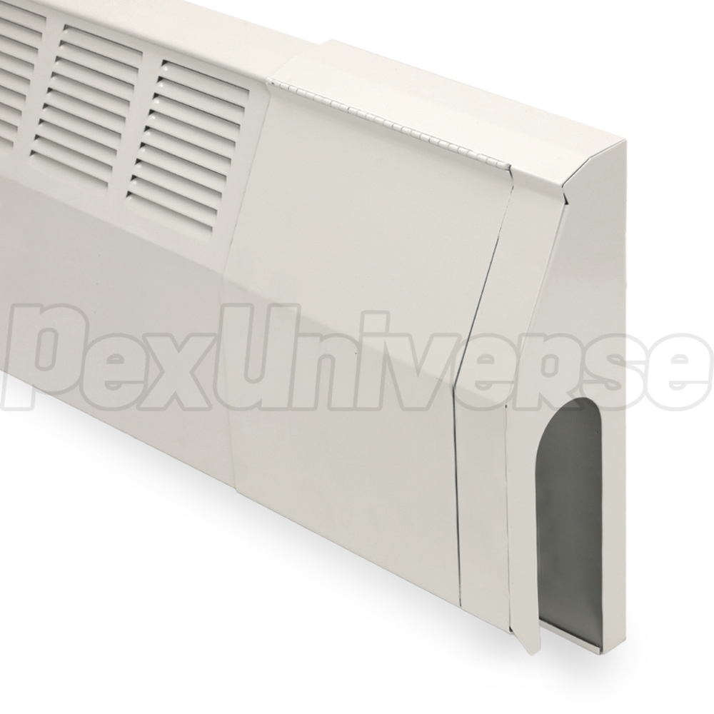 Extra-wide slotted hinged slip-on Right valve cover for 350-14 baseboard by Slant/Fin, provides convenient access to shut-off, temperature regulating or an air bleeder valve. Slotted opening accommodates pipe where it penetrates adjacent wall. Durable white enamel finish.