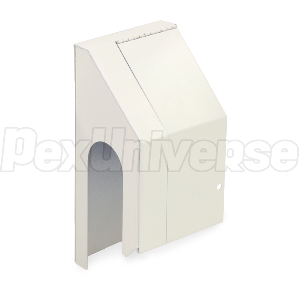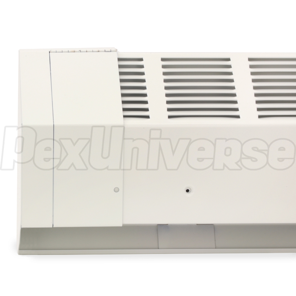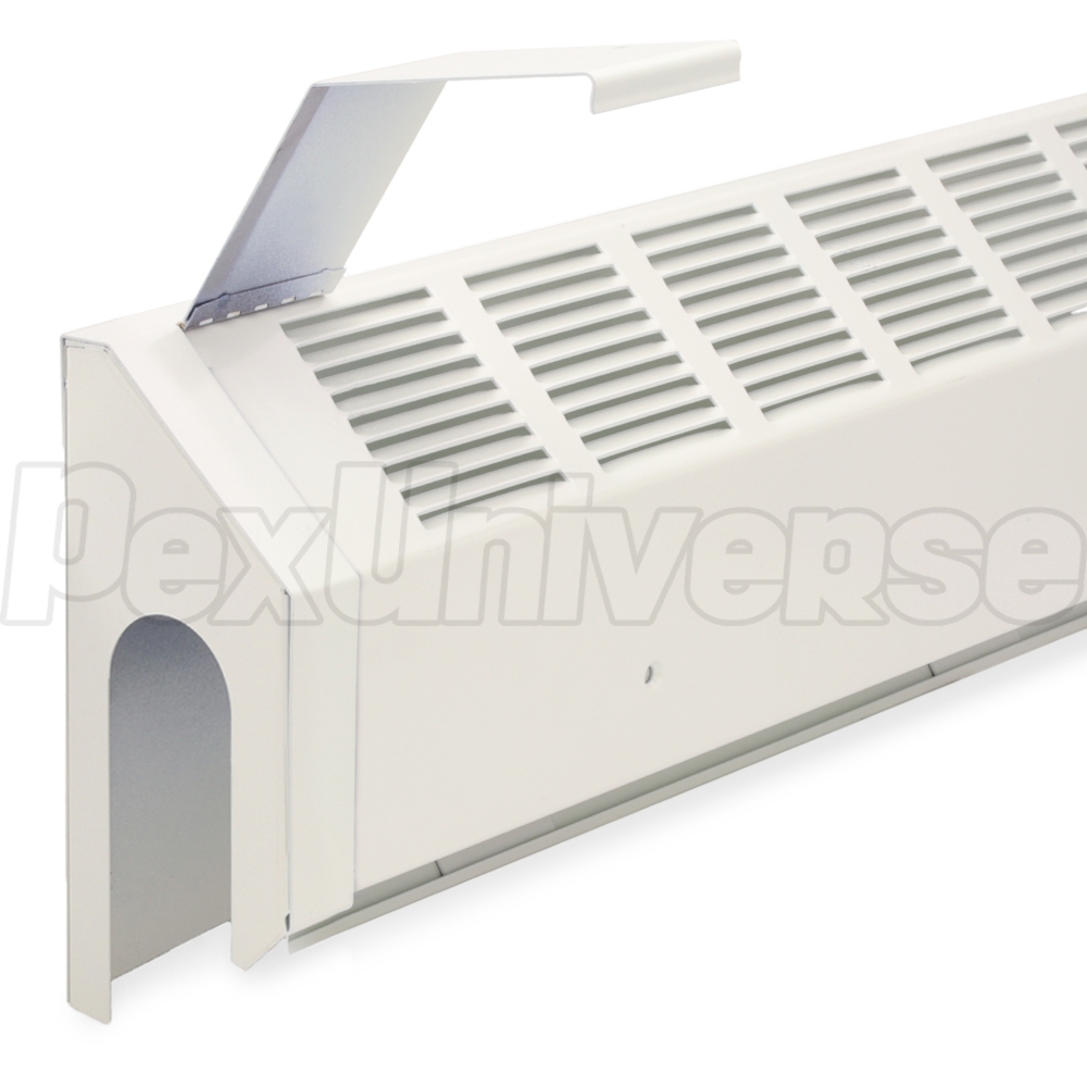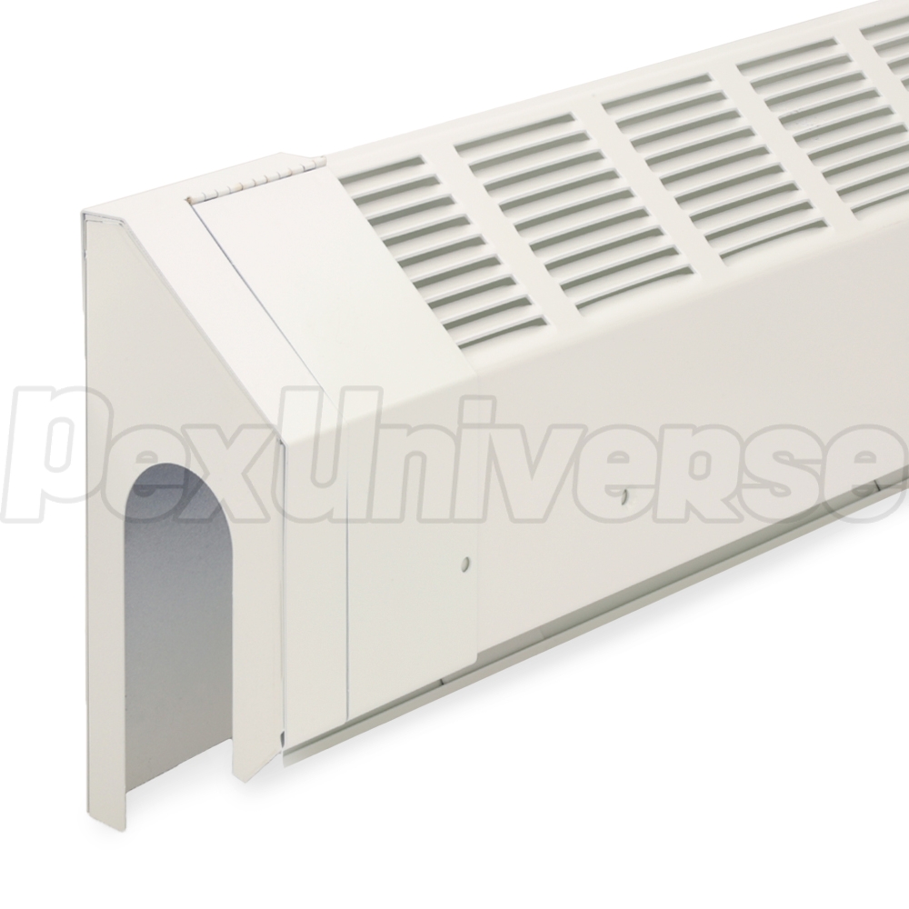 Slotted, hinged, slip-on Left end cap for HD-850 series baseboard - covers the end of the baseboard and provides convenient access to a temperature regulating, shut-off or an air bleeder valve. Slotted opening accommodates pipe where it penetrates adjacent wall. Allows to cover small gaps between the baseboard and adjacent wall. White enamel finish.