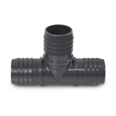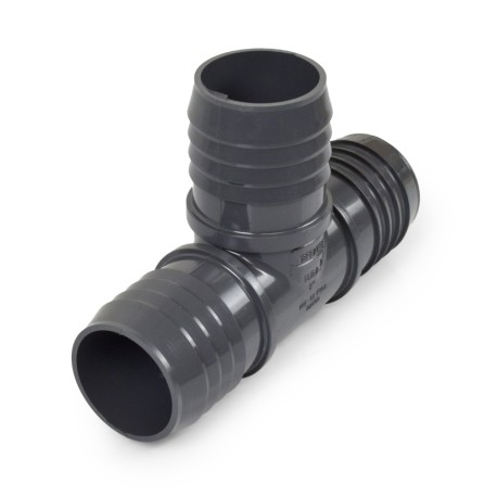 2" barbed PVC tee fitting connects (3) same size (equal) flexible pipes/hoses together in a T-pattern.