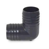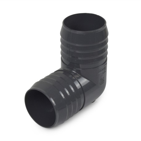 2" barbed PVC insert elbow fitting connects two same size flexible pipes/hoses at a 90-degree angle.