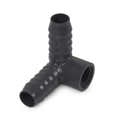 3/4" barbed x 3/4" barbed 90-degree PVC insert elbow with a 90-degree 1/2" female NPT threaded outlet.