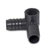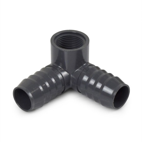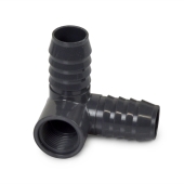 1" barbed x 1" barbed 90-degree PVC insert elbow with a 90-degree 3/4" female NPT threaded outlet.