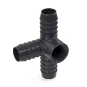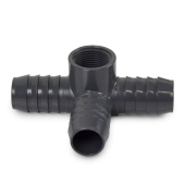 1" barbed PVC insert tee fitting with a 90-degree 3/4" female NPT outlet connects a threaded pipe/nipple/outlet to (3) flexible pipe/hoses joined in a T-pattern.