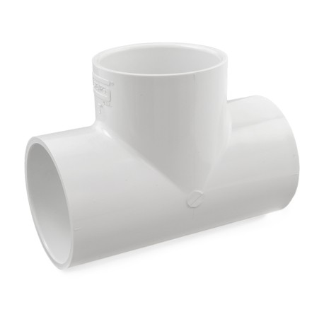 This schedule 40 tee connects three 3" PVC pipes in a T-pattern. Socket (hub) connections on all outlets.