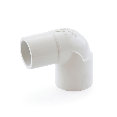 This schedule 40 elbow fitting connects a 1" PVC pipe to 1" PVC elbow fitting at a 90-degree angle. Socket (hub) x spigot connections.