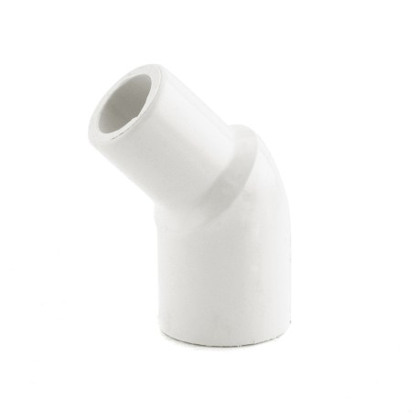 This schedule 40 elbow fitting connects a 3/4" PVC pipe to 3/4" PVC elbow fitting at a 45-degree angle. Socket (hub) x spigot connections.