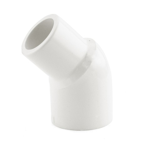 This schedule 40 elbow fitting connects a 1-1/4" PVC pipe to 1-1/4" PVC elbow fitting at a 45-degree angle. Socket (hub) x spigot connections.