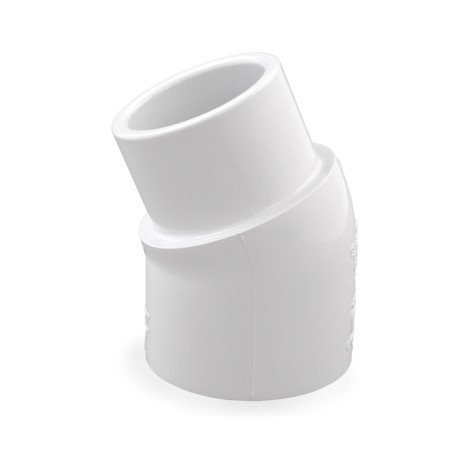 This schedule 40 street elbow fitting connects a 2" PVC pipe to 2" PVC fitting at a 22.5-degree angle. Socket (hub) x Spigot connections.