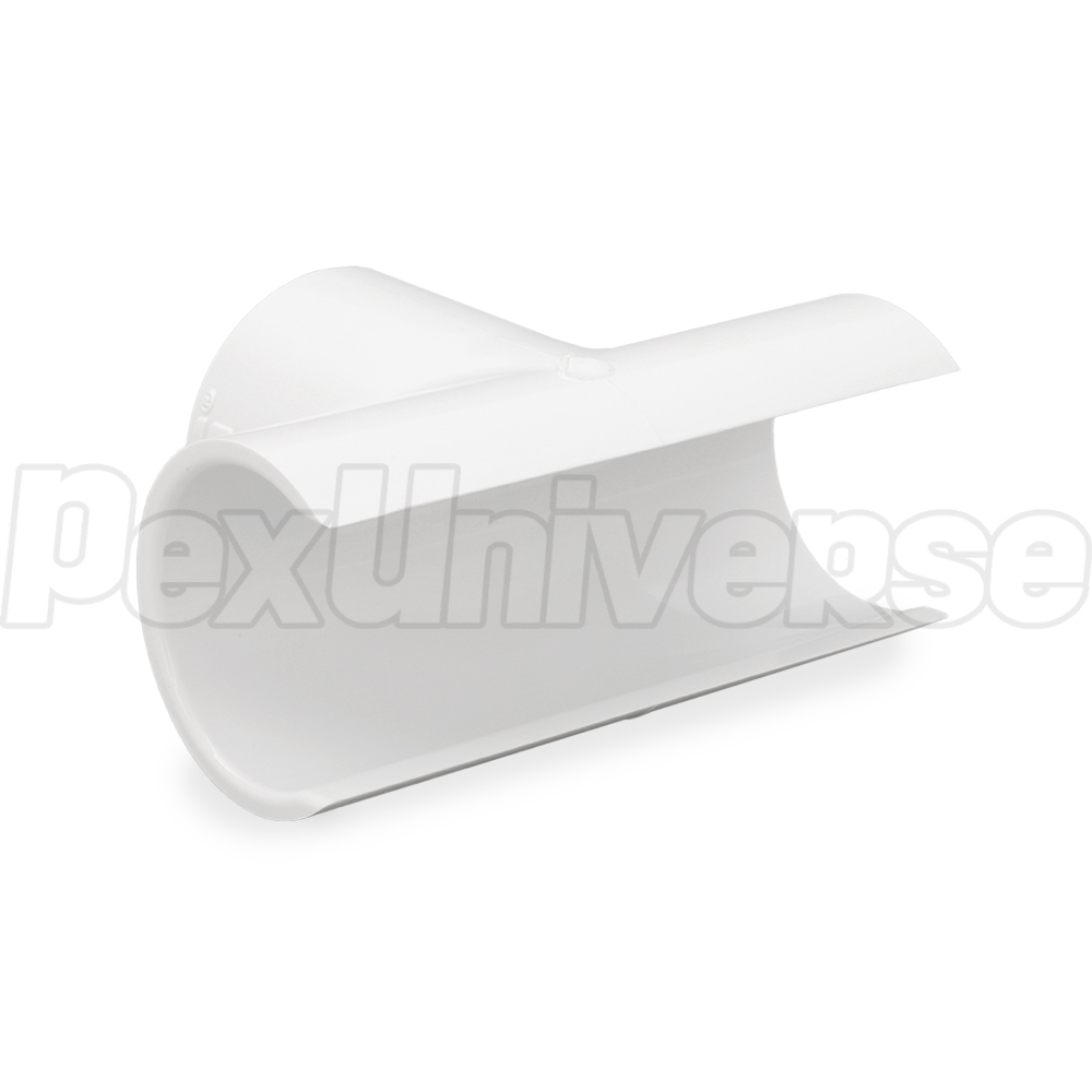 Snap-on, hot-tap pipe saddle (saddle tee) for 1-1/4" PVC pipe with a 1-1/4" Socket outlet. Snaps over the pipe for easy position adjustment without the need for extra support. Uses PVC cement + primer to secure over the pipe.