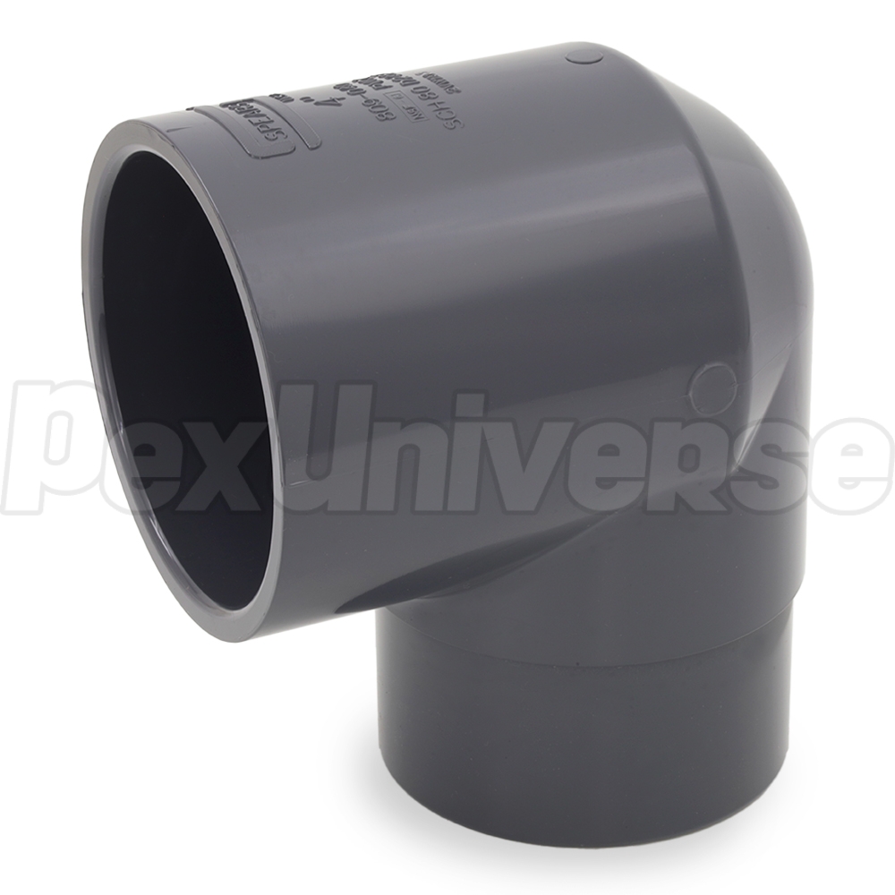 This elbow fitting connects 4" Sch 80 PVC pipe to a 4" Sch 80 PVC fitting, valve or outlet at a 90-degree angle. Socket (hub) x Spigot (equivalent to PVC pipe) connections.