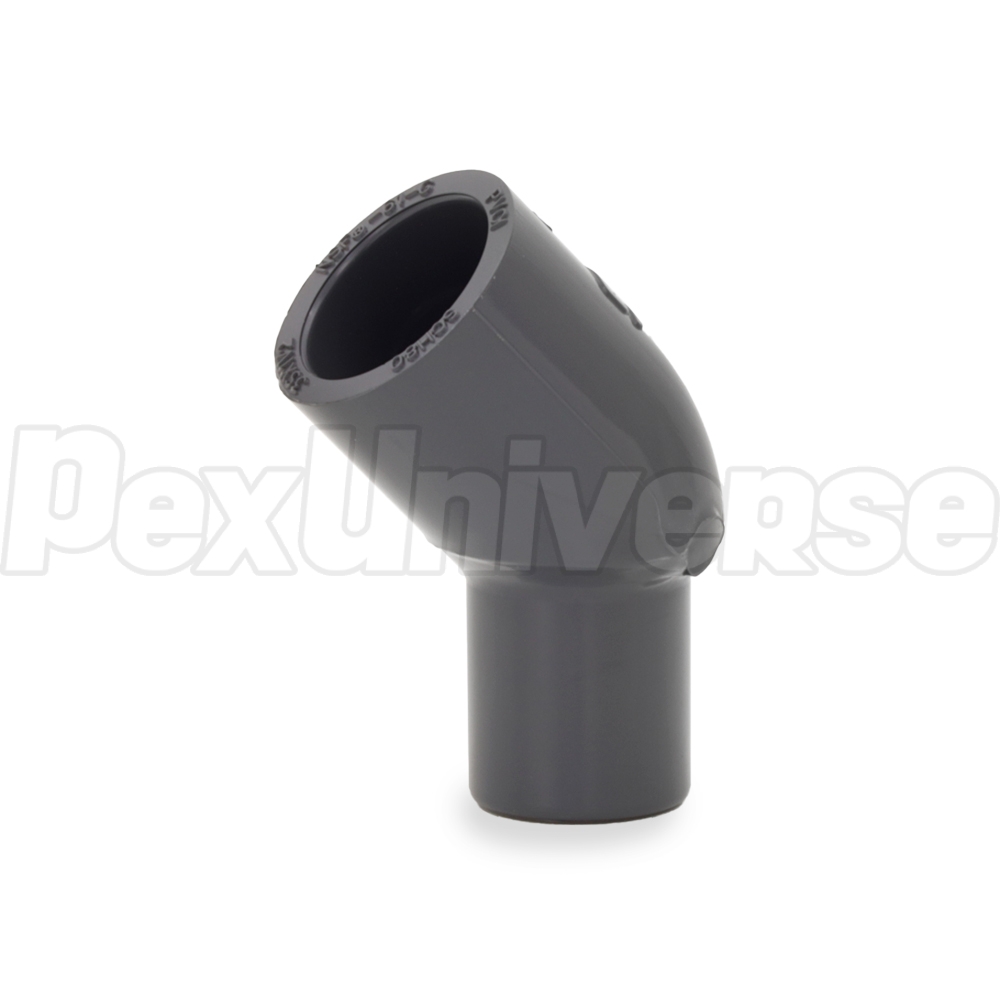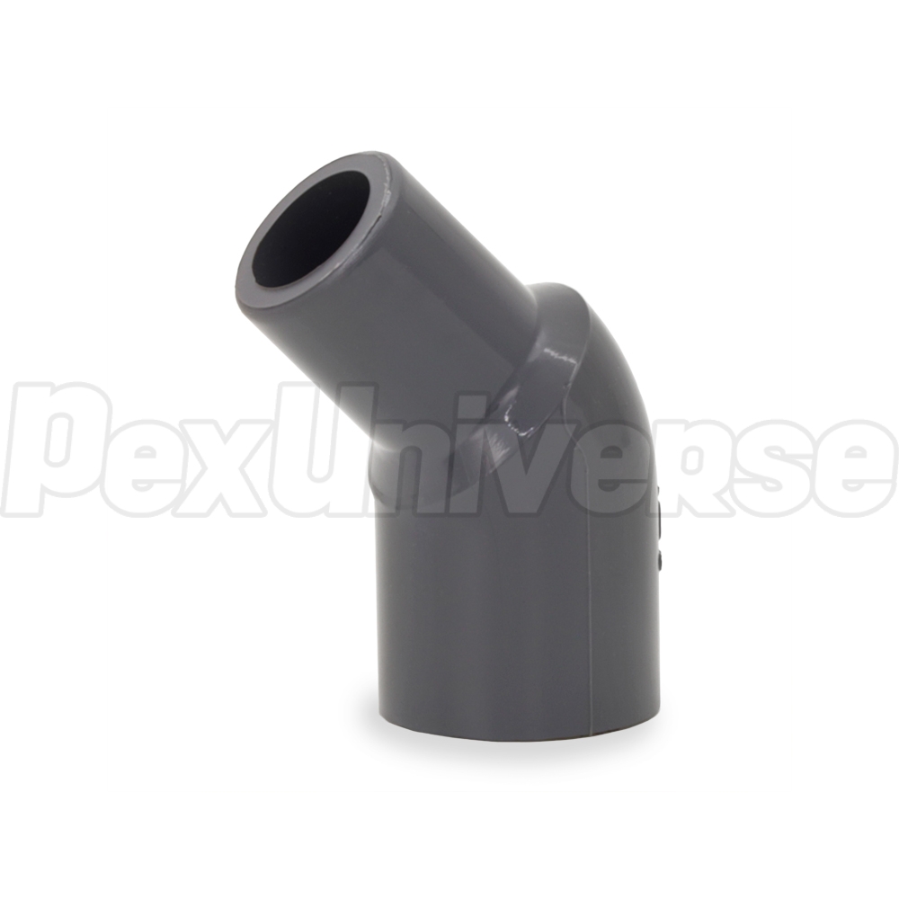 This elbow fitting connects 3/4" Sch 80 PVC pipe to a 3/4" Sch 80 PVC fitting, valve or outlet at a 45-degree angle. Socket (hub) x Spigot (equivalent to PVC pipe) connections.
